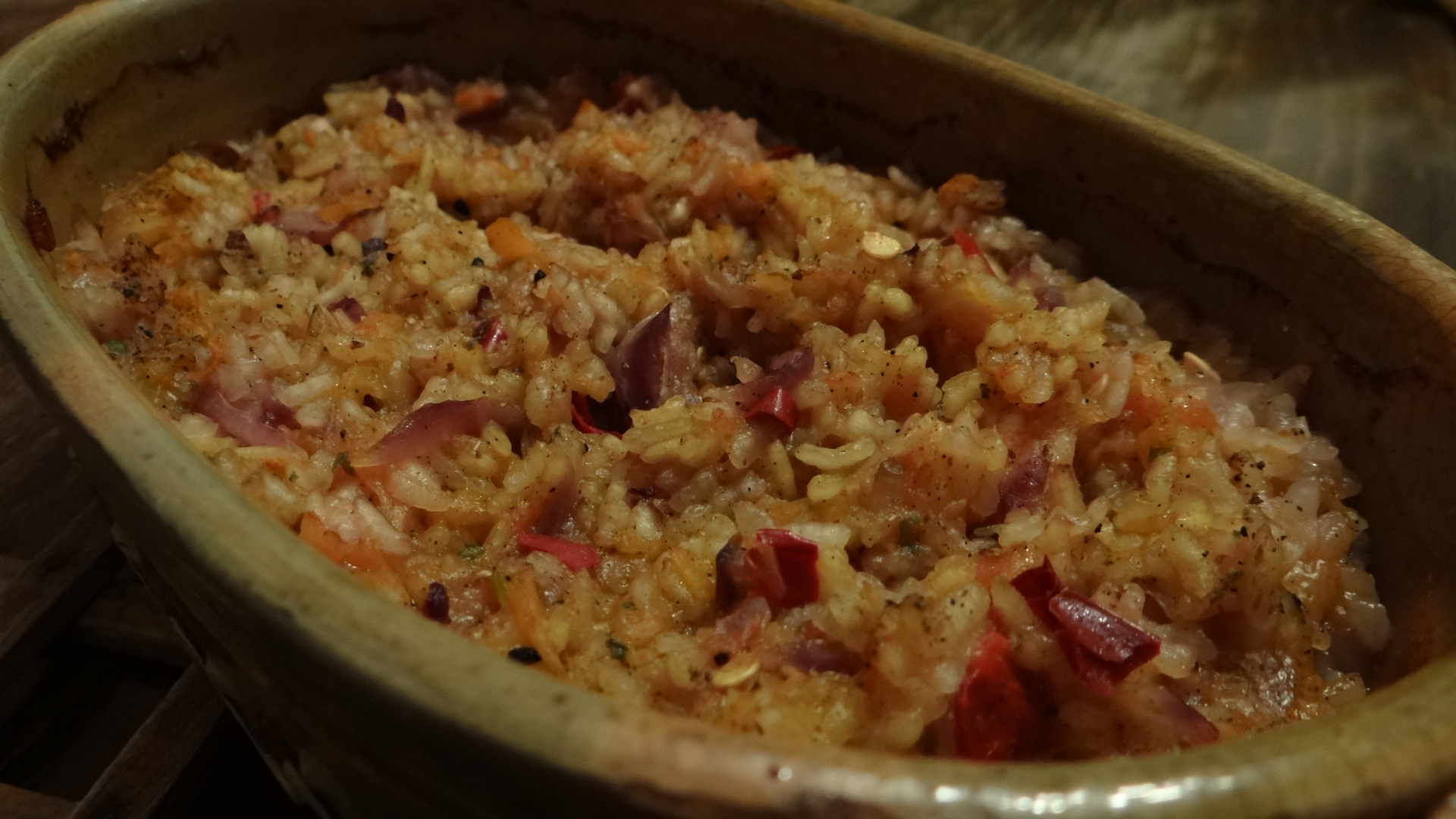 In the meantime place the grated carrots in a different pot, put some oil (to your taste) and fry a little on low heat stirring constantly with a wooden spoon. When the oil starts turning orange add the onion. Stir until onion turns glassy and then add the garlic. Fry a little longer stirring constantly. It is very important that you don’t stop stirring because the ingredients may burn and stick to the bottom of the pot. Now add the tomato, the dry red pepper, and the cabbage. Stir some more, about 2-3 minutes, and then add the washed rice. Preheat oven to 250°C (482°F). Stir about 2-3 more minutes.
