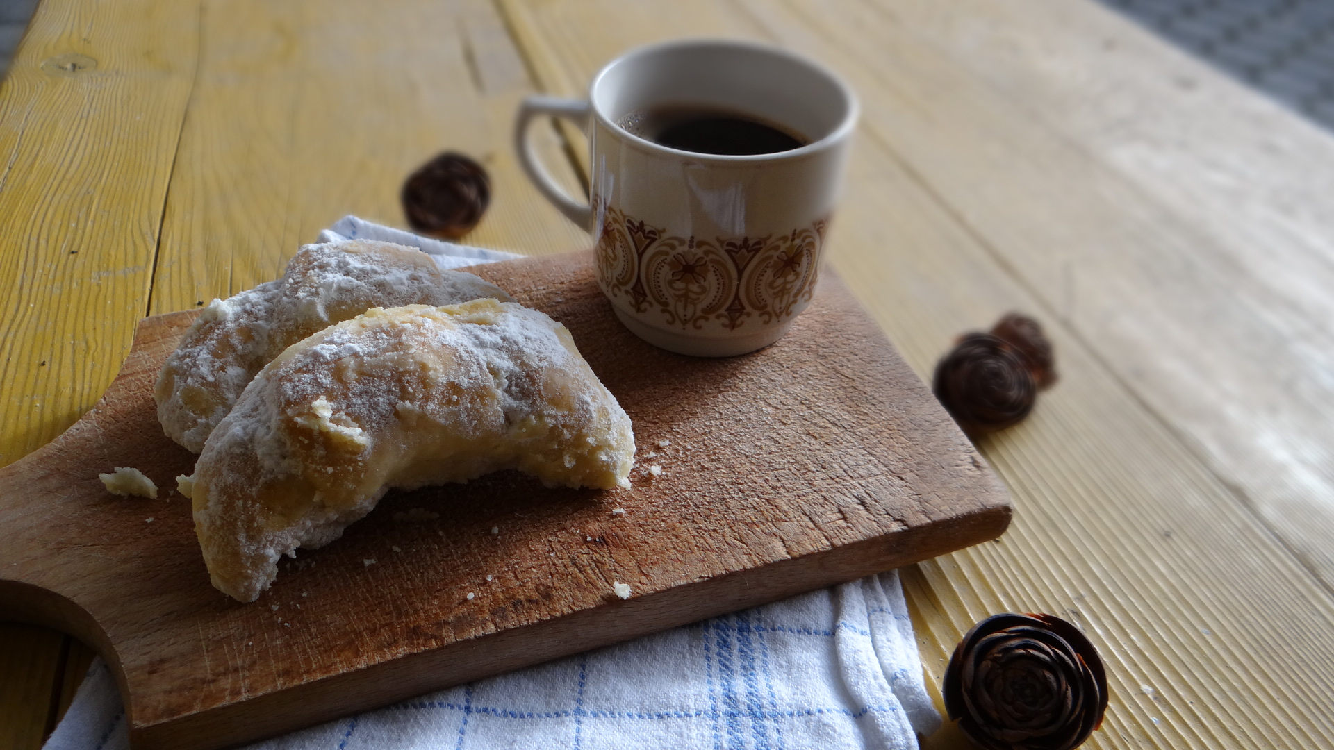 Take a large bowl and add the ingredients in the order indicated. Start by adding 800 g flour, and add more if needed. Once the dough is ready divide it into 35 balls. Make each ball into a triangle. Put 1 tsp of marmalade and ½ tsp hazelnut, walnut, and almond mixture at the broadest part of the triangle. Make it in a roll. Place the rolls on a greased baking sheet (you can use baking paper if you want to avoid the hard work that goes hand in hand with removing burnt and stuck cookie dough from the bottom of a pan). Preheat the oven to 200C. Place sheet in oven and bake for 30-40 minutes, or until rolls turn golden brown. Remove from oven and put on a cooling rack. After the rolls are cool enough to be handled roll them around in powdered sugar and put them on a serving plate. Sift some more powdered sugar on top. They go perfectly with sugar-free black coffee.