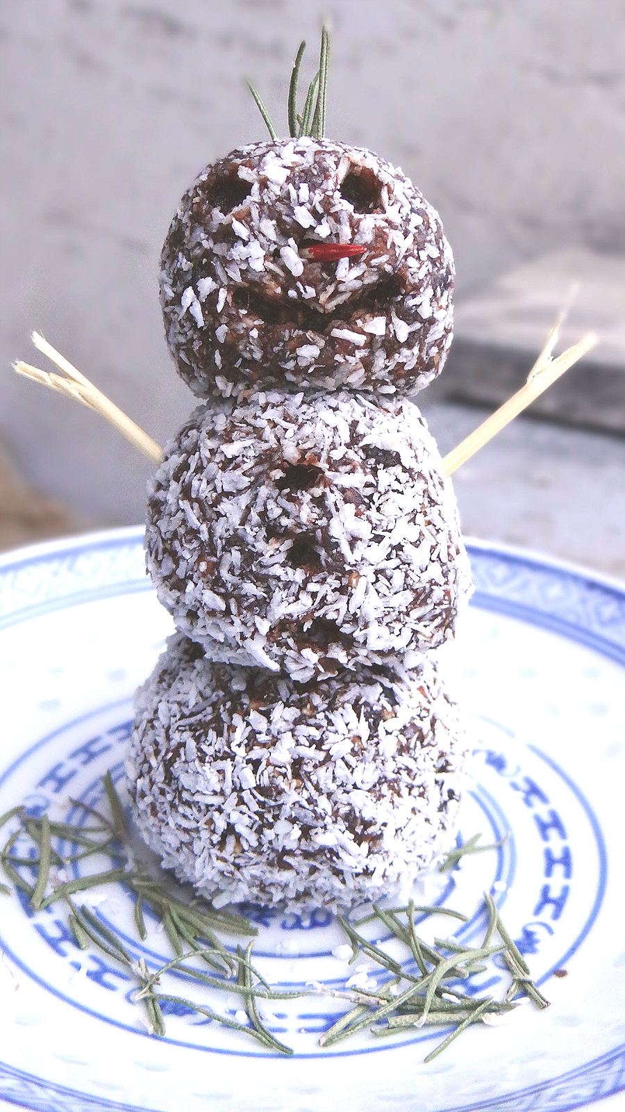 Put all of the ingredients in a big deep bowl and knead until the dough is compact. Then take a golf-ball-sized piece of dough and put a whole almond, hazelnut, or half a walnut in the middle. Form a nice ball and roll it in coconut flakes. Put them on a cool plate and you can either serve them right away or store them in the fridge for a couple of hours and eat them cold. I like it when chocolaty things are cold, how about you?