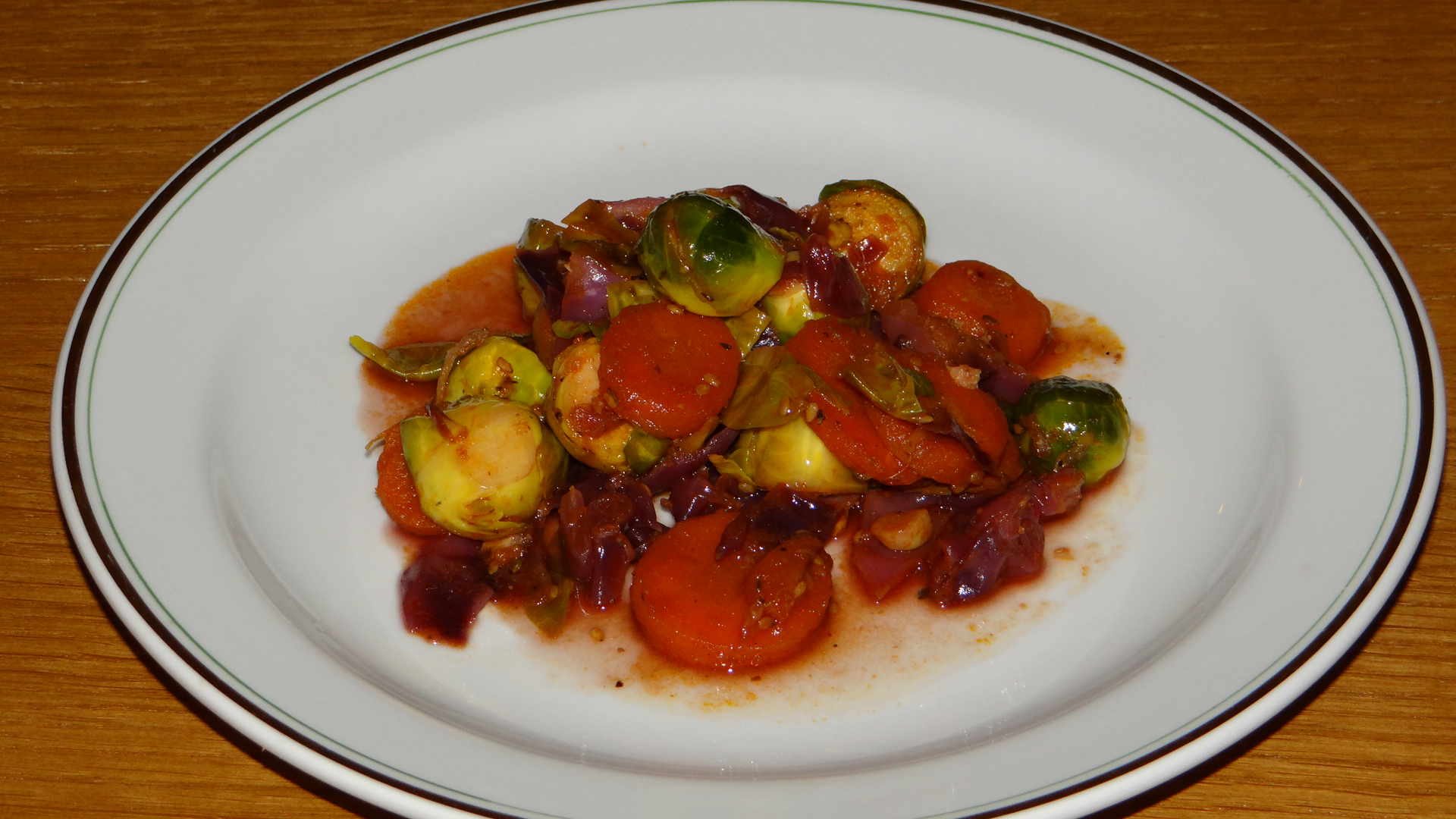 Take a large pan and melt the butter. Add the finely chopped garlic and red onion. Cook on low heat. Chop the carrots into circles and add them to the pan once the onion and garlic have softened. Add the cabbage and cook at a low heat for about 2-3 minutes. Add the Brussels sprouts and cook a little longer until you start feeling the fragrance of the sprouts. Now add the vinegar, and 2-3 minutes later add the tomato sauce. Cook for a couple of minutes and let the tastes mix well together. Add the spices and serve warm with a piece of crunchy homemade French bread.