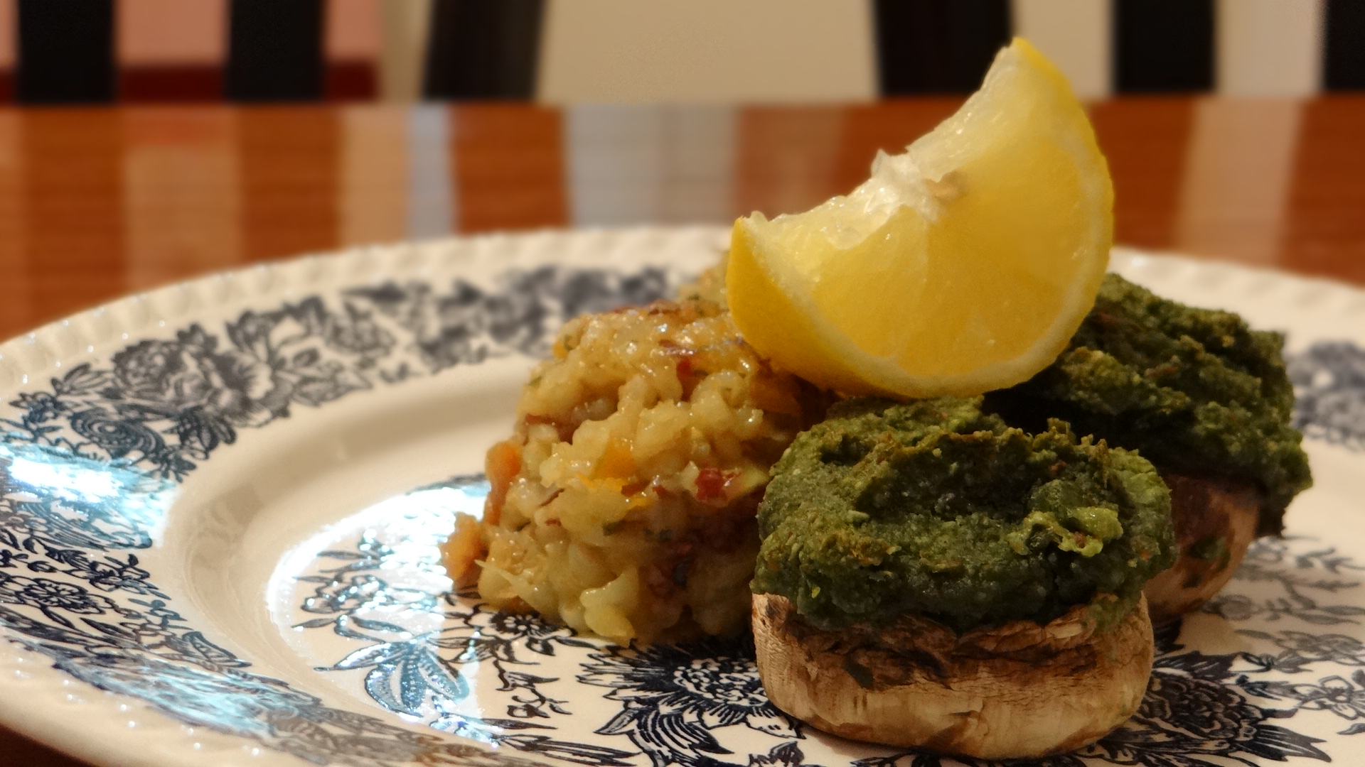 Preheat the oven to 350°F (180°C). Process each ingredient in the food processor and combine everything in a big bowl. Do not forget the mushroom stems! Add olive oil enough to make the batter compact. Take a big rectangular baking dish and line it with baking paper. Place the mushrooms in it and start stuffing them using a long handled teaspoon. It is OK if you make little peaks while stuffing the mushrooms.