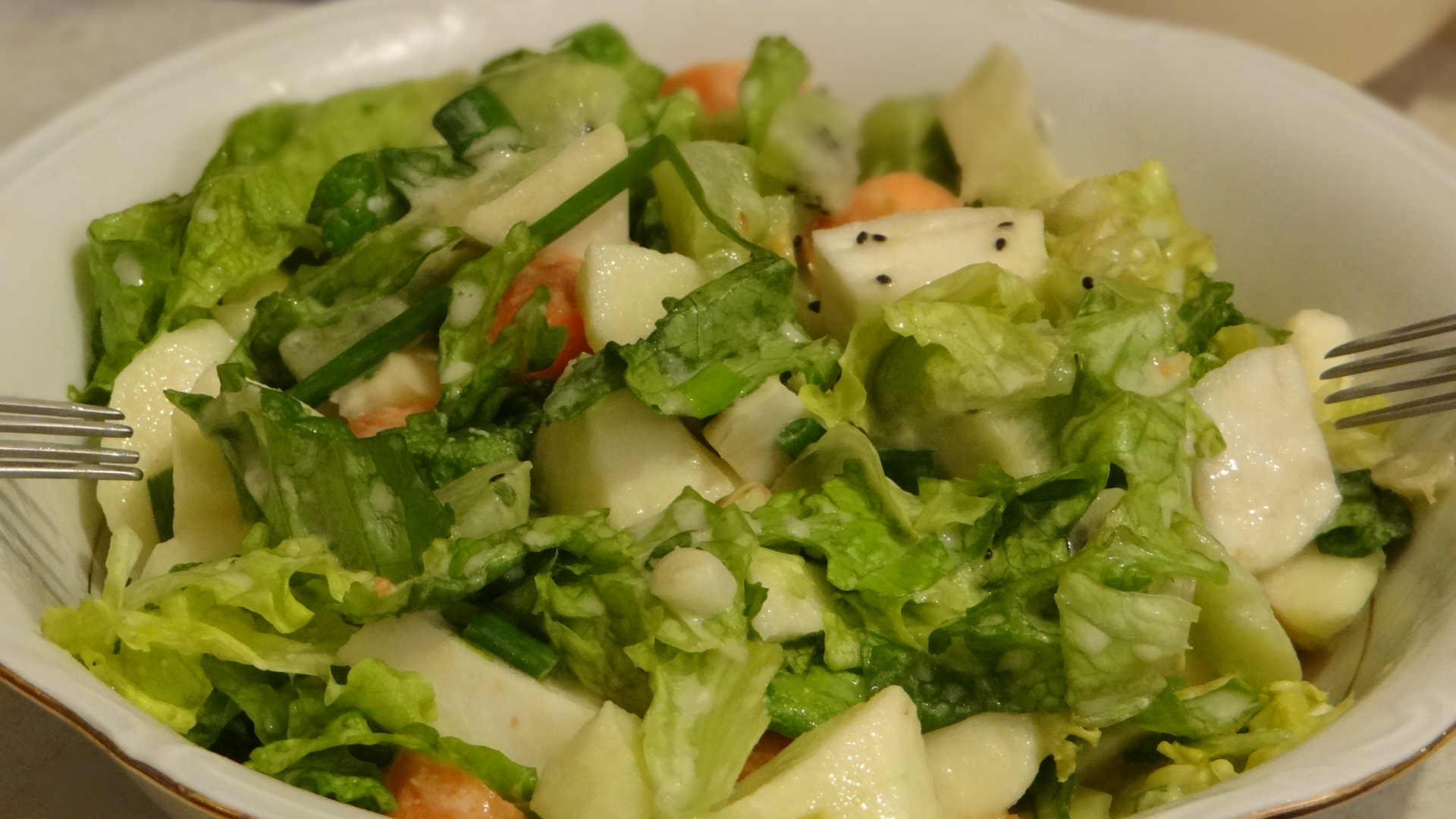 Во мојот вчерашен пост веќе пишав дека сум болна. Вчера многу ми беше лошо и никако не можев да отидам до продавница и да си купам што ми треба за да си го направам оригиналниот рецепт за Волдорф. Затоа, само собрав што најдов во шпајз и сѐ што мислев дека ми е потребно за да си направам витаминска бомба. Ова е моја верзија на Волдорф и предупредувам дека не е наменета за оние што се плашат да пробуваат нови видови храна (на пр. М не сакаше да ја допре салатава со десетметарски стап, едвај го намолив да ја фотографира). Ама тоа значи дека има повеќе за мене!