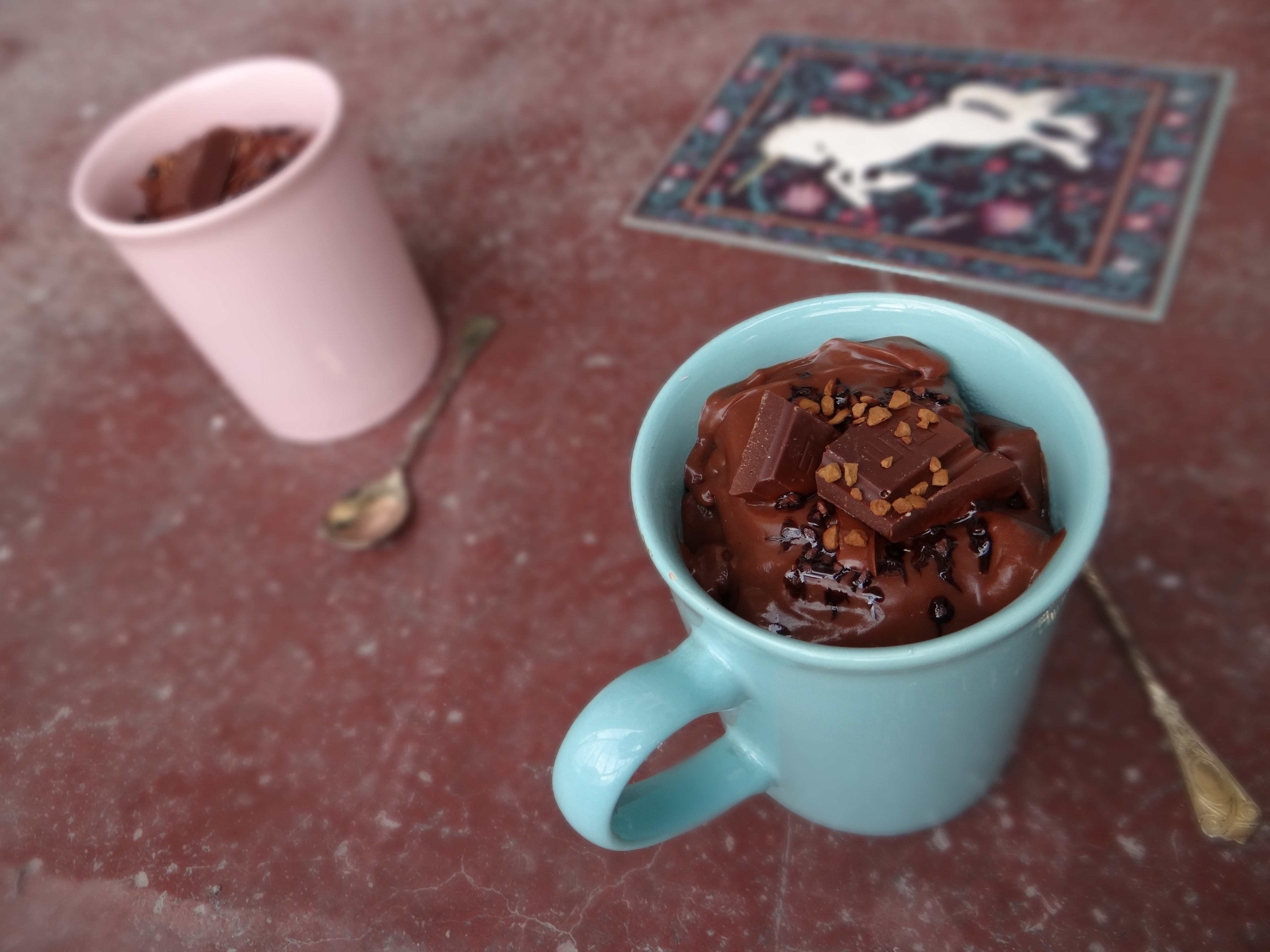 Place the contents of the pudding package in a larger cup along with the sugar and add about 5-6 Tbsp out of the 500 ml liquids. Stir it well, making sure all the lumps are broken. Put the rest of the liquids in a pot and bring it to a boil. Remove the pot from stove. Add a couple of tablespoons of the boiled liquids to the pudding mixture and then pour all of the pudding mixture back in the boiled liquids. Take a wooden spoon and return the pot to the stove. Cook for a minute or two at extremely low heat stirring constantly. When all of the mixture is nice and smooth add the chocolate. Don’t stop stirring. Once you’re sure that all of the chocolate has melted, pour it in two cups. Garnish with chocolate chips and instant coffee crystals. Serve warm.