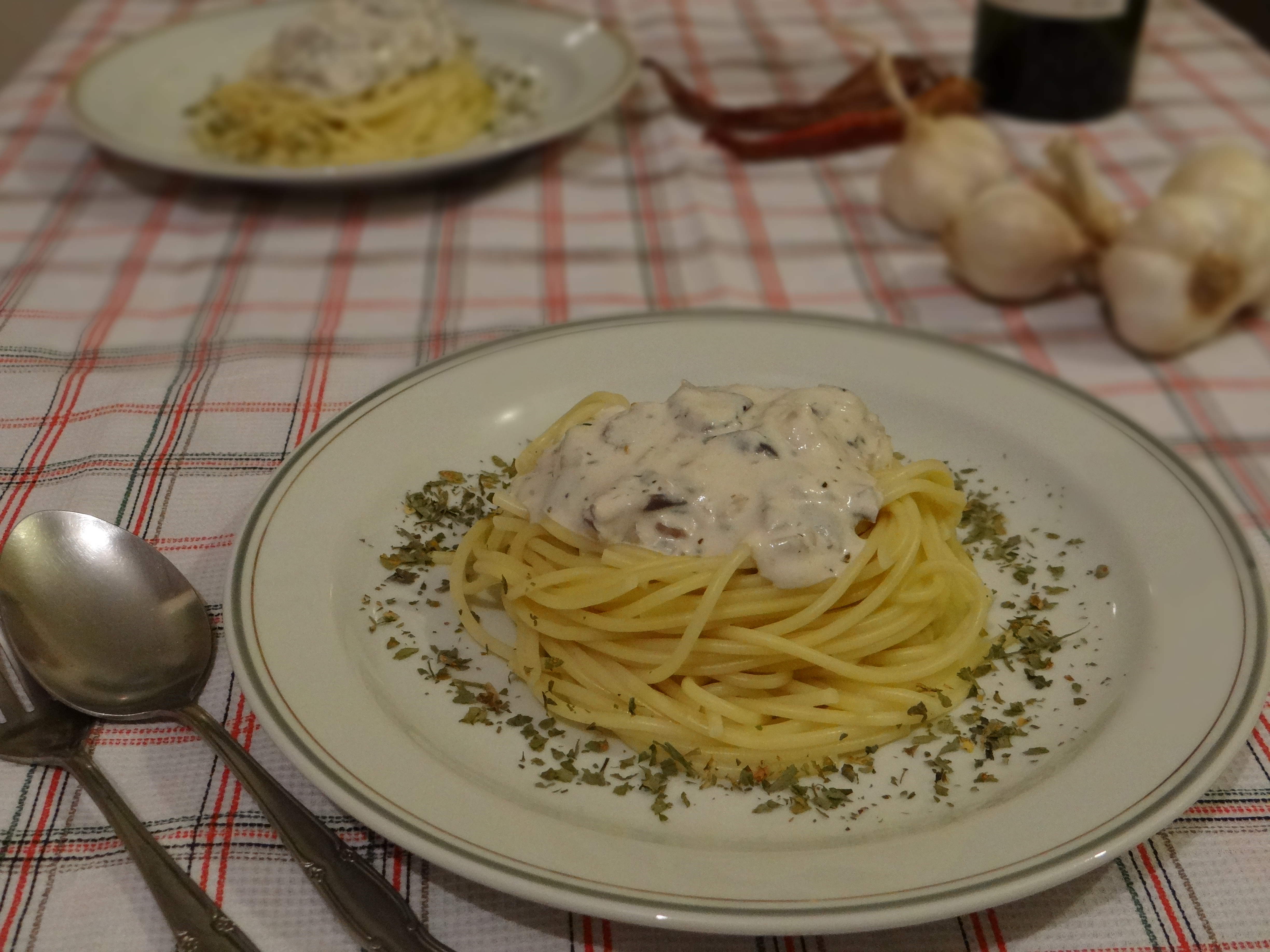 Finely chop together the garlic and the onion. Place them in a large skillet over low-medium heat. Drizzle some oil and stir from time to time using a wooden spoon. When the onion turns glassy add the mushrooms and cook for another 5-10 minutes or until the mushrooms soften. Add the cooking cream and the spices and cook for another 5 minutes until the flavors combine completely. Pour the wine about 2-3 minutes before you remove the skillet from the stove. Serve warm with a nice glass of vegan white wine.