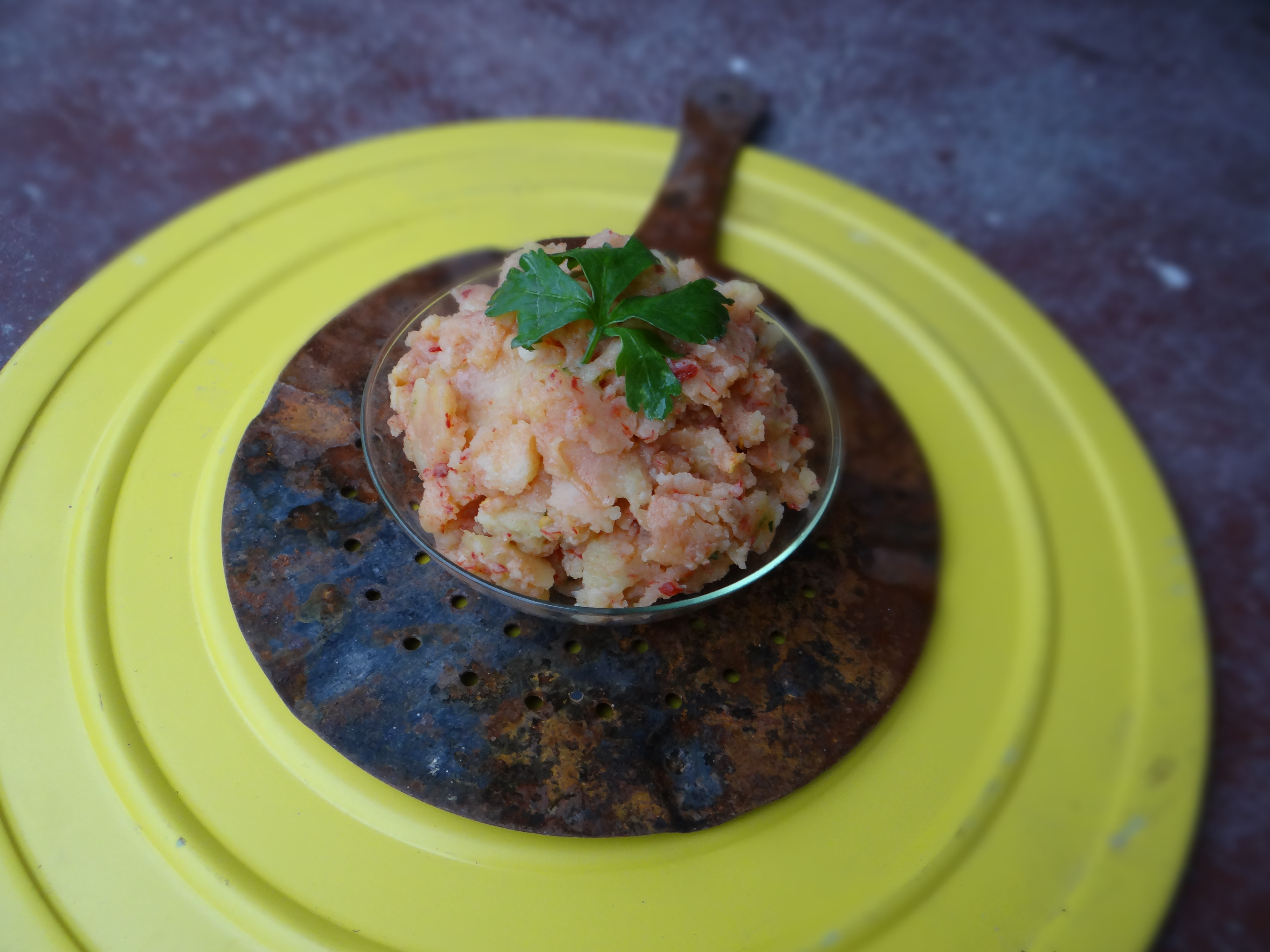 Take a small knife and a tsp. Open the peppers lengthwise and take the meaty inside using a spoon. Discard the skins. In a separate bowl pestle the leek (into oblivion!). Add the scraped meaty part of the peppers and the boiled potatoes. Pestle everything until it is well combined. Add salt and pepper to taste along with some of the water the potatoes and peppers were boiling in. The mixture should be smooth. Warm up the 3 Tbsp of oil and pour it over the mixture while still sizzling. Stir and serve right away.