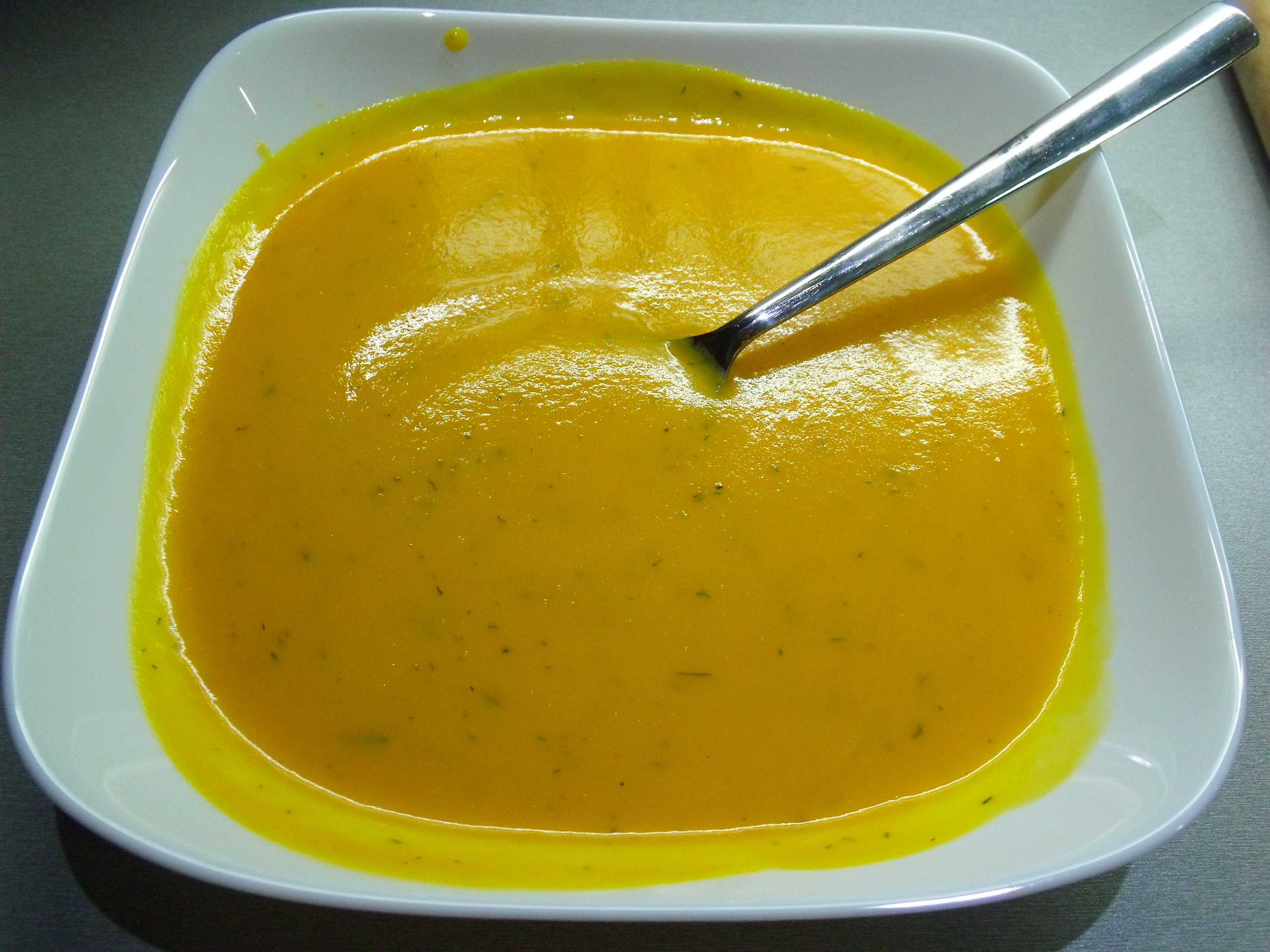Chop the onions and the carrots (onions in cubes, carrots in circles), warm up the olive oil in a pot and then sweat them together with some salt and pepper for 8-10 minutes. After the water from the carrots has evaporated, add 1.5 liters of cold water, throw in the potato, the vegetable soup cube, and mix it up. Put a lid on the pot and let it all simmer for 20 minutes. When done, blend it all together to a creamy mix, add some dill and put it back on the stove on a very low heat for just 2 minutes so all the flavors combine. Serve chilled or warmed, whichever you prefer.