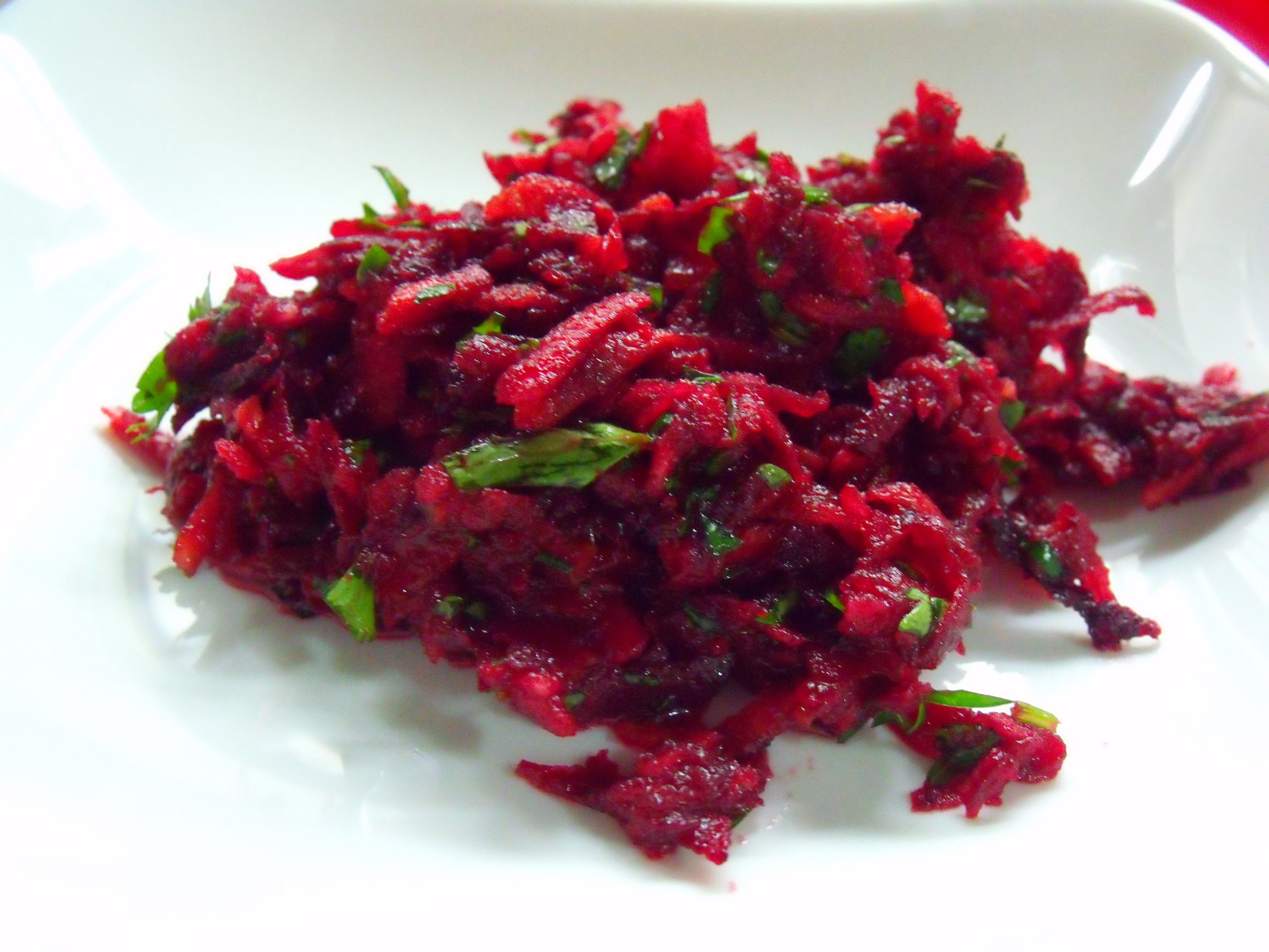 Just grind the beetroot, carrot and apple, chop the parsley and mix it all up with salt, pepper, olive oil and balsamic vinegar. Adjust the taste and don’t put too much balsamic vinegar in.