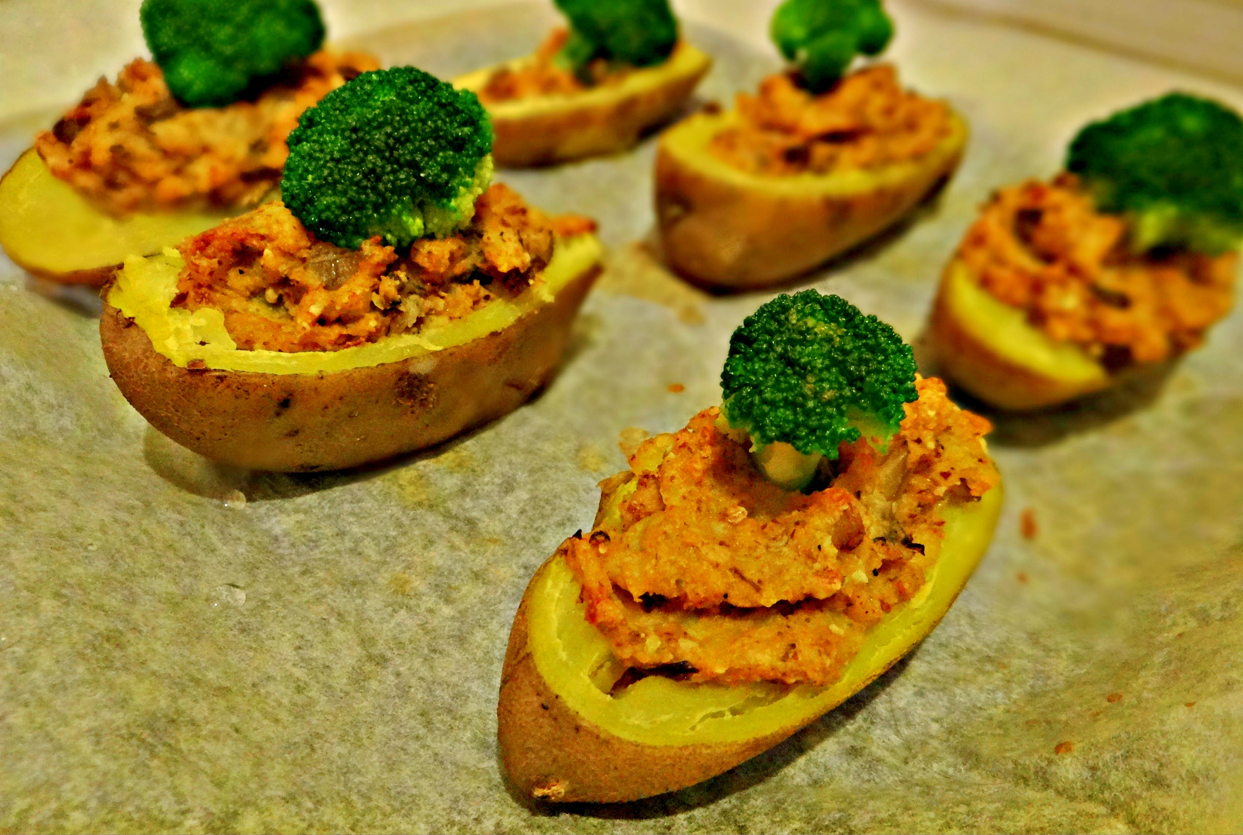 Add the purée in the pan with the fried garlic and mushrooms. Add the remaining ingredients and stir until well combined. Take a Tbsp and fill the potato gaps with the mixture. Place the baking sheet in a 480°F preheated oven. Take them out after 10-15 mins or until they turn golden brown.