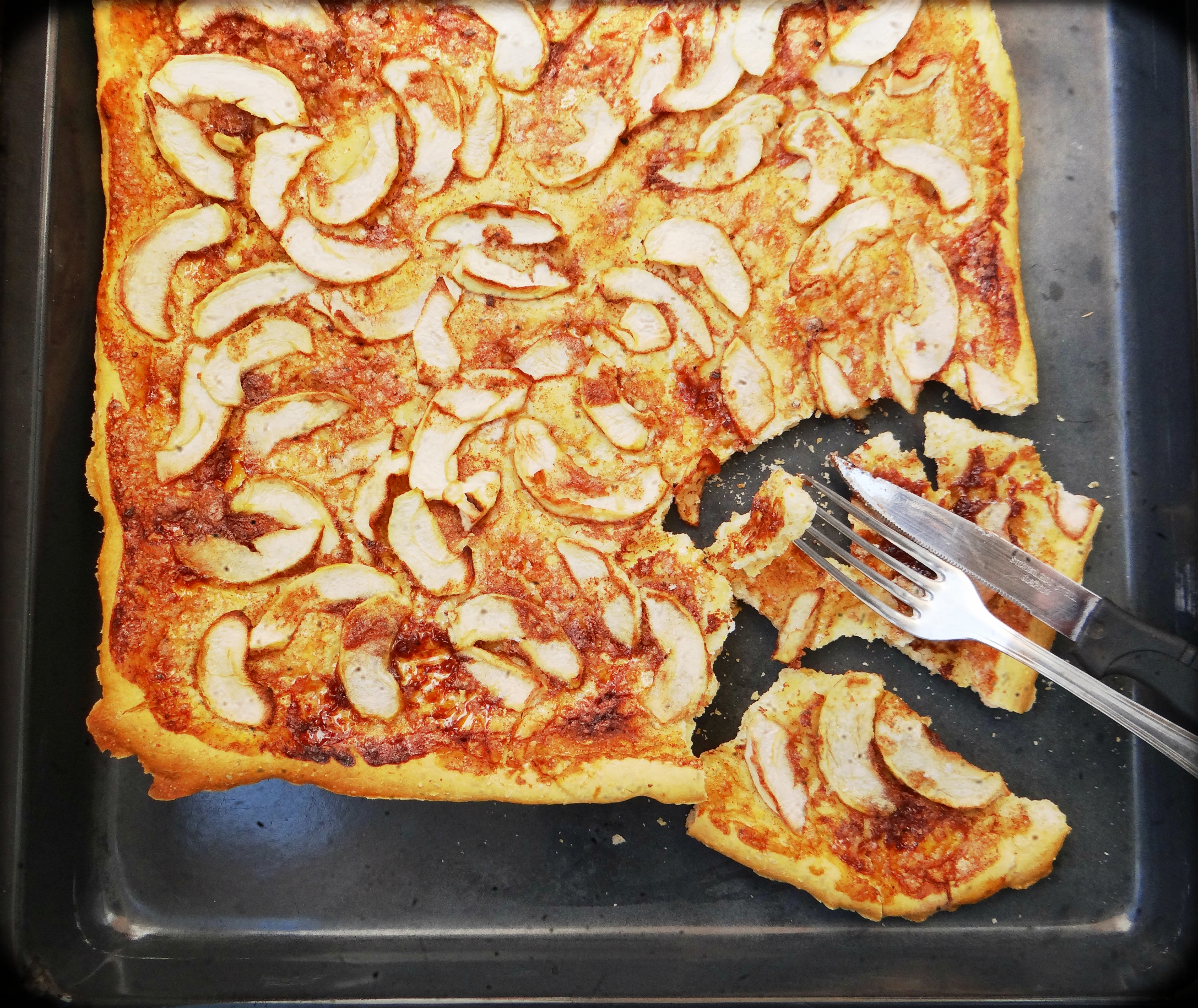 Wash and peel the apples (if you must, and if not buying organic) and cut them into wedges. Divide them in half. Spread one half evenly over the first dough and drizzle the remaining cinnamon and allspice syrup. Repeat with the second dough.