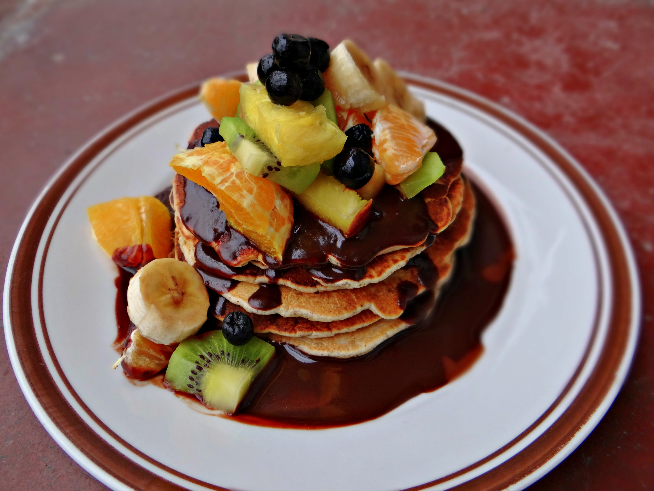 Put the chocolate and the butter in a double boiler. Once the mixture starts melting add the Maraschino and some water to adjust the thickness. Pour over your stack of pancakes, garnish with fresh fruit and enjoy right away. Unsweetened coffee is always a good choice for me to go with meals like these!