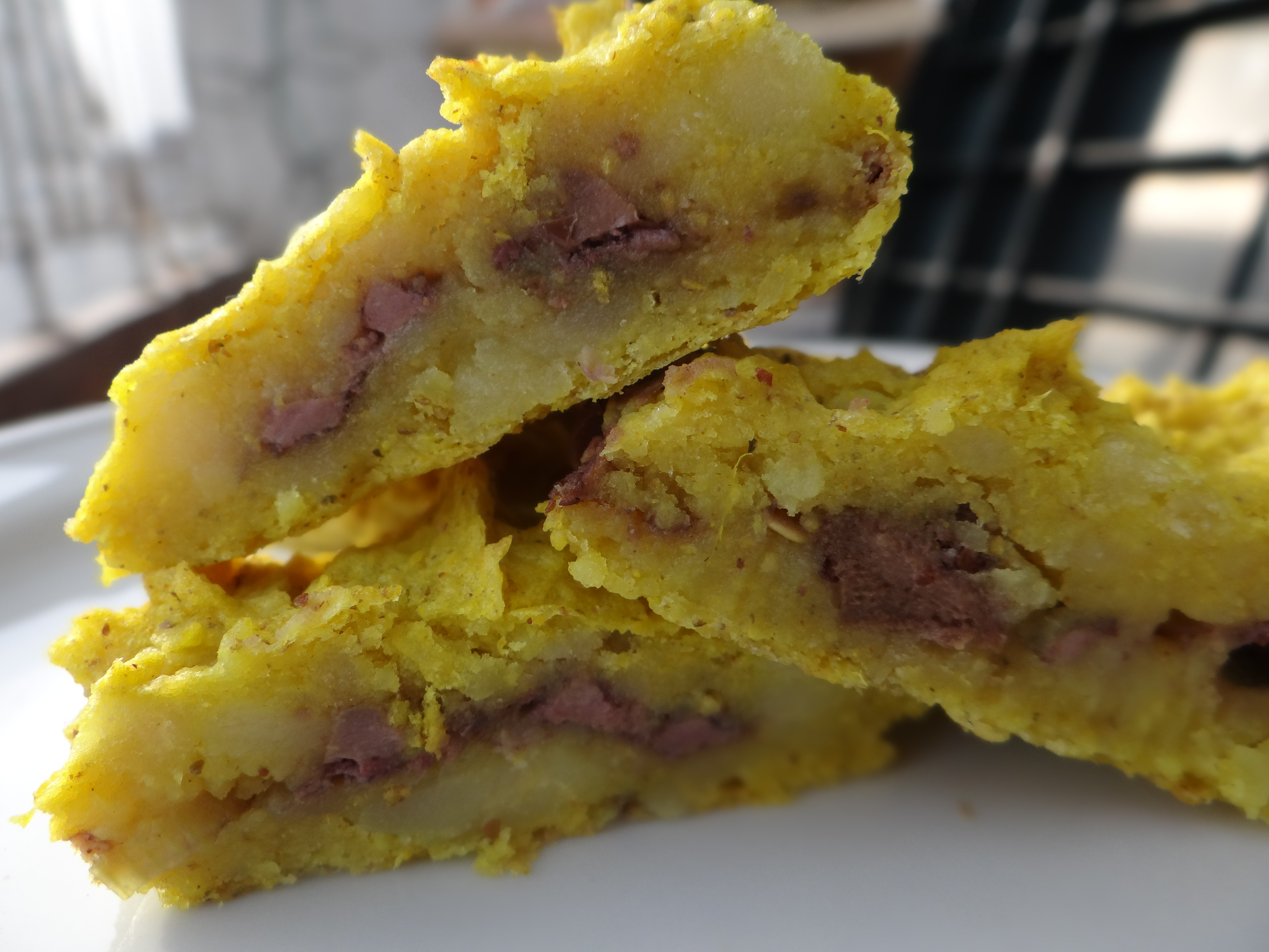 Компирите се префрлаат во длабок сад и се гмечат убаво со виљушка. Им се додава и палентата. Се става зејтин, сол, бибер и куркума и се меша убаво. Ваквото тесто е лепливо на рацете, не знам како би изглегло ако му се додаде брашно. Ако некој проба да ми каже.