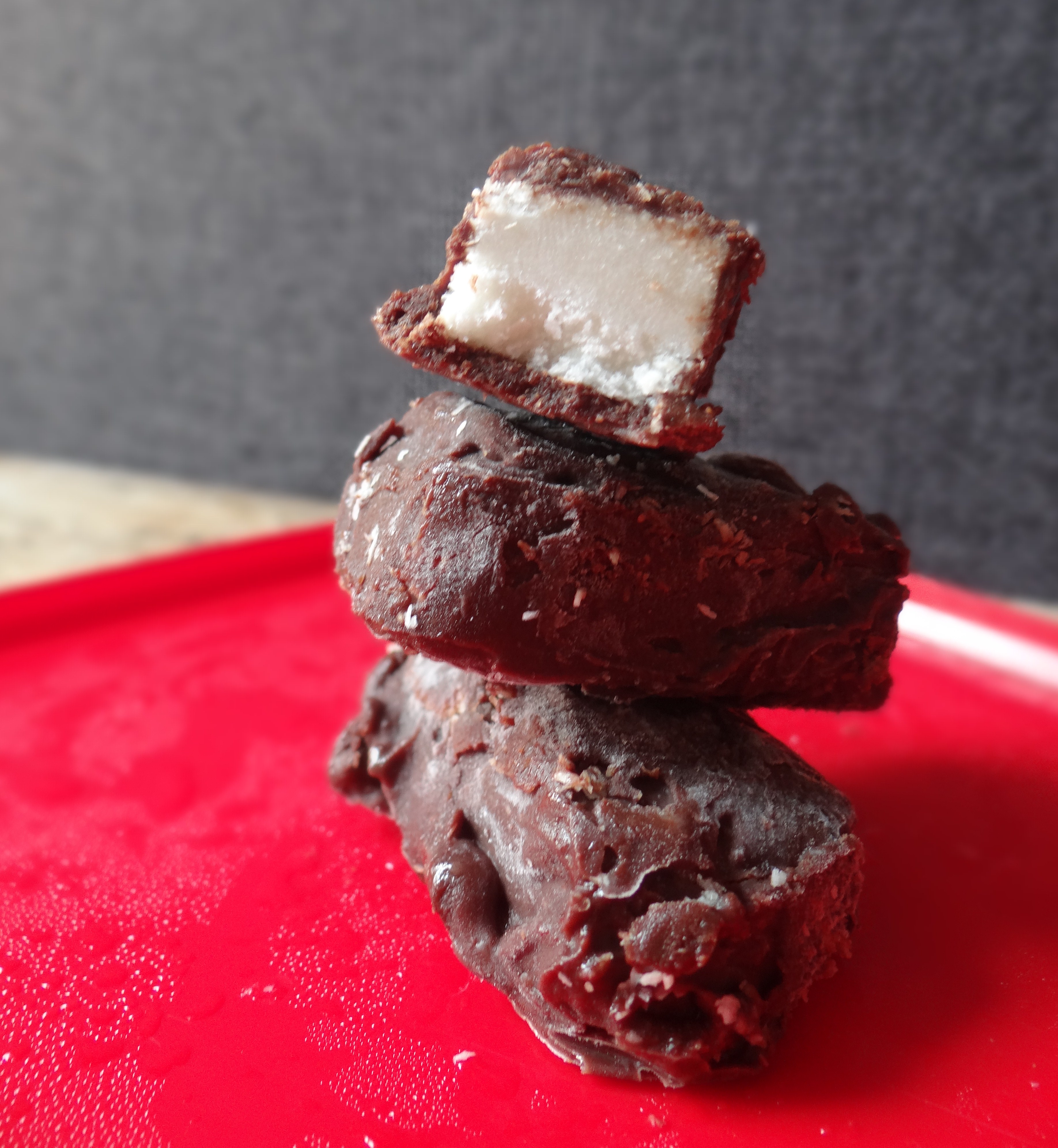 Наредниот ден (недела :D) ставете го чоколадото да се стопи во двоен сад и додајте му го млекото. Смесата со кокос извадете ја од замрзнувач и ставете ја на големо парче целофан. Исечете ја во посакуваната димензии со жежок нож. Меѓу одделните чоколатца треба да има малку повеќе простор за да има место да се манипулира со ножот кога ќе го ставате чоколадото. Удавете ги во чоколадо.