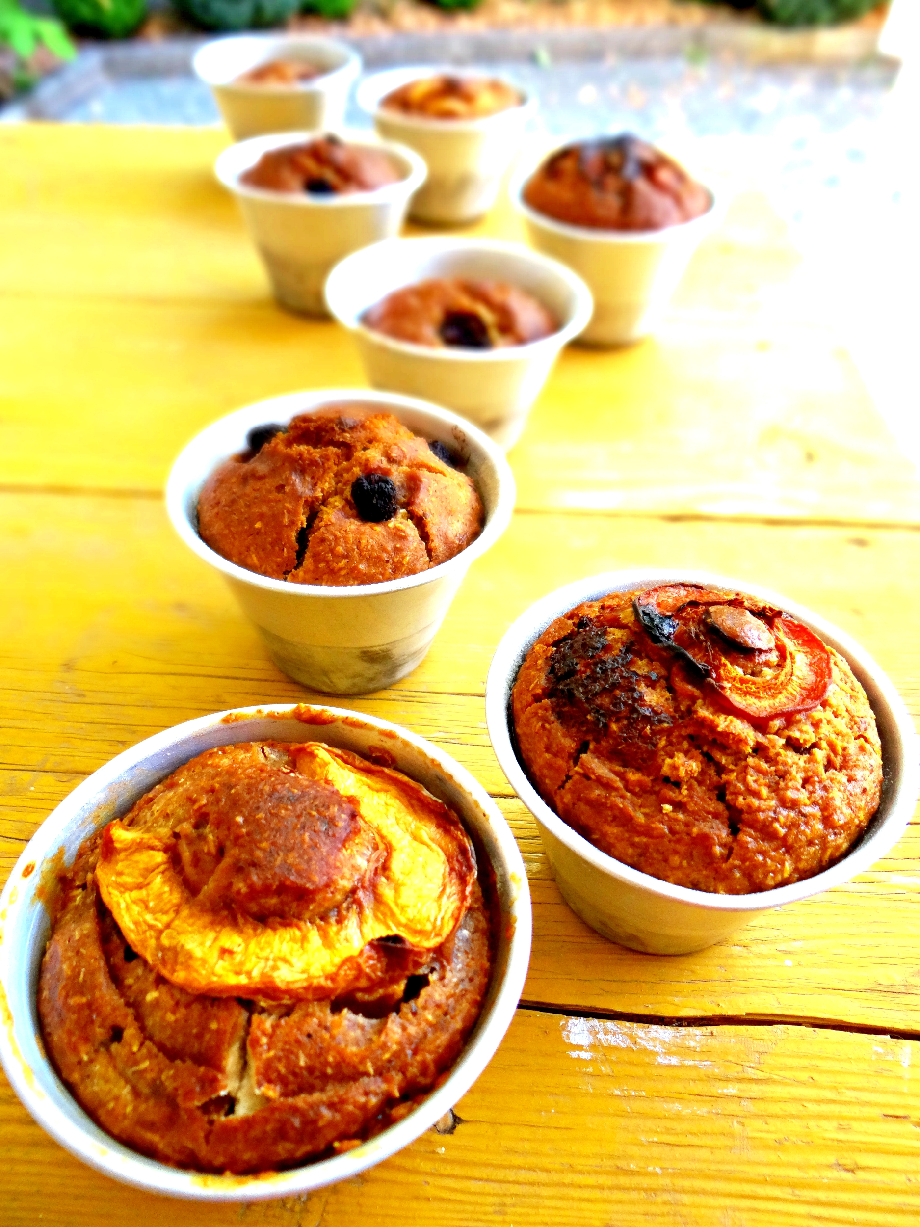 Take 8 ramekins (approximately 5 cm in diameter). Oil them and coat them with flour. Put 1 Tbsp of the batter, add a quarter of one kind of fruit, add another Tbsp of the batter, another quarter of the fruit, another Tbsp of batter and finish off with the decoration pieces.
